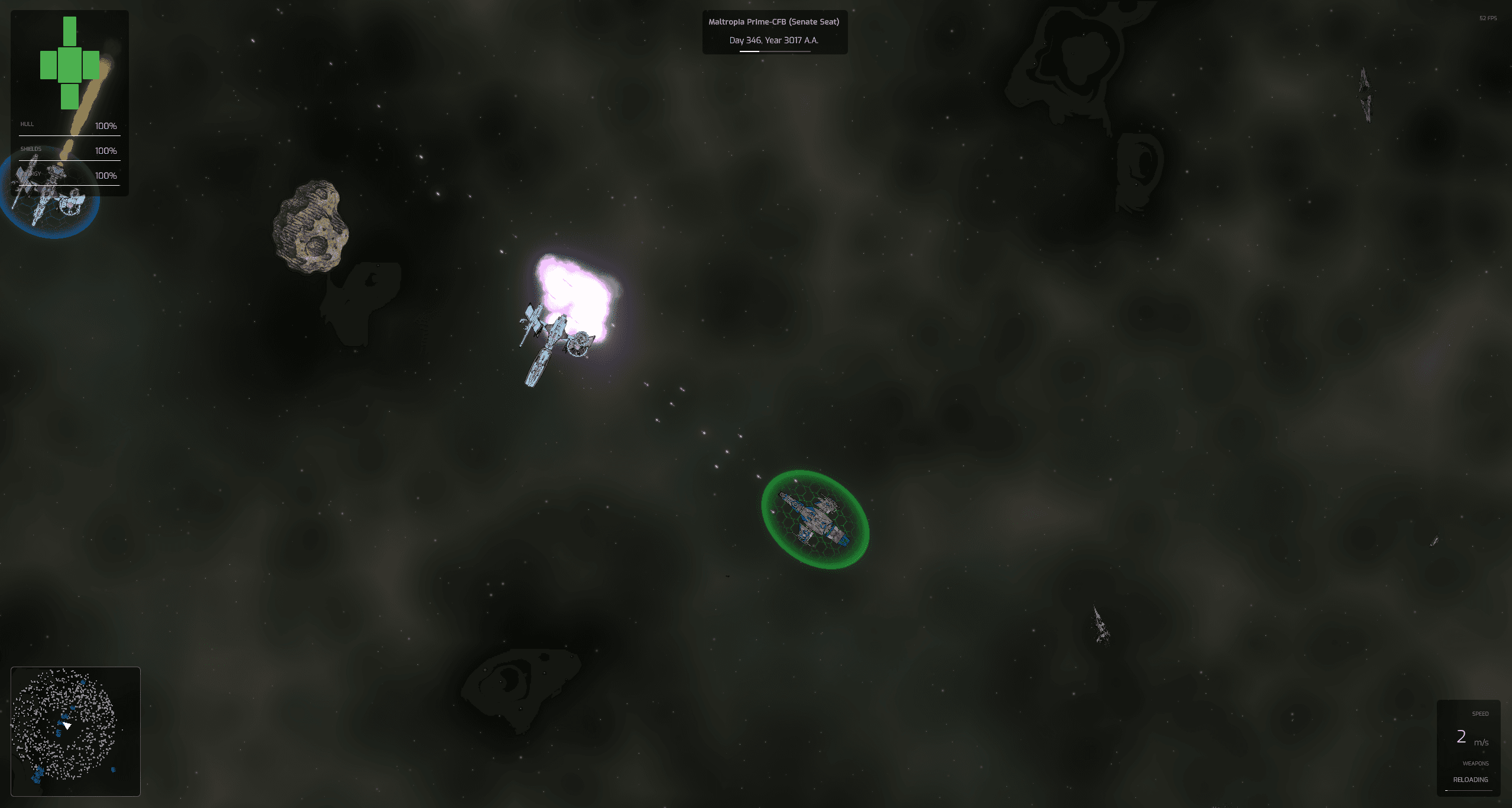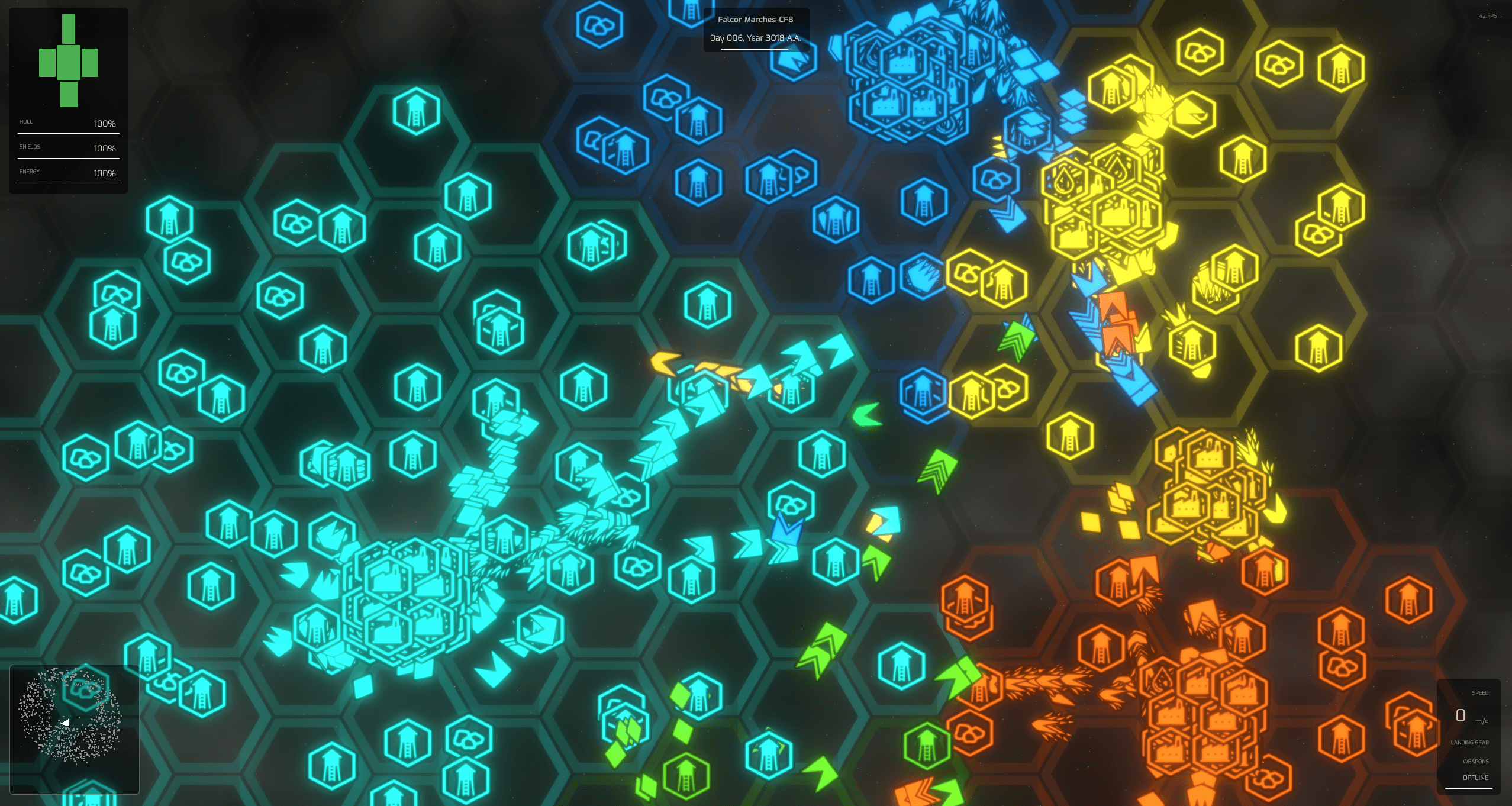 Information is itself a resource. Factions know only the sectors they have scouted; intelligence decays without renewal. Save and quit, and the galaxy waits in the file with you. Load it back, and the thread picks up — every named pilot, every standing alliance, every ledger entry, where you left them.